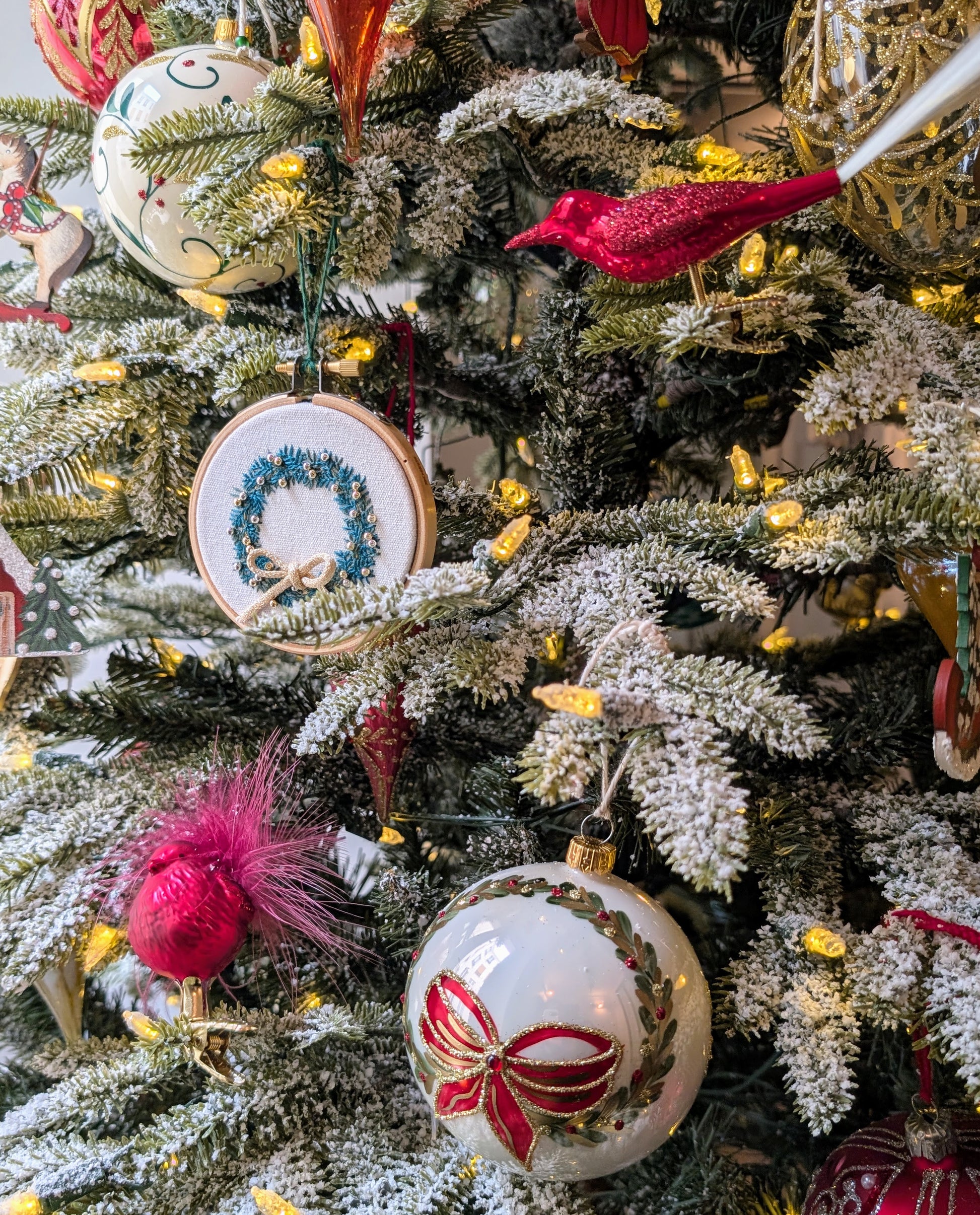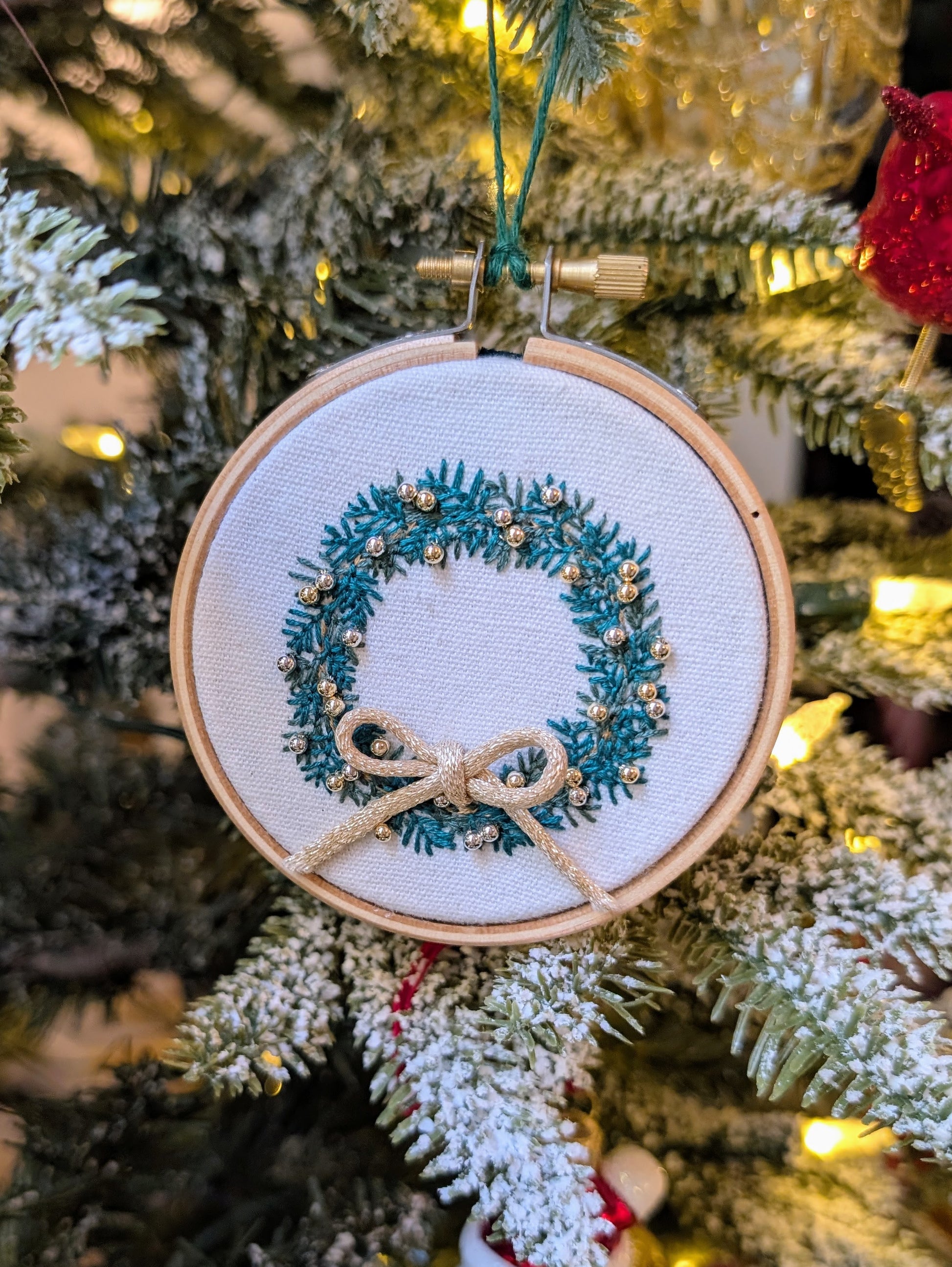 Un effet très 90's pour cette couronne de sapin brodée à la main et serti de perles dorées et argentées. Son nœud en ruban tube métallisé lui ajoute une touche capturant la lumière. Un ornement parfait pour un décor rétro.