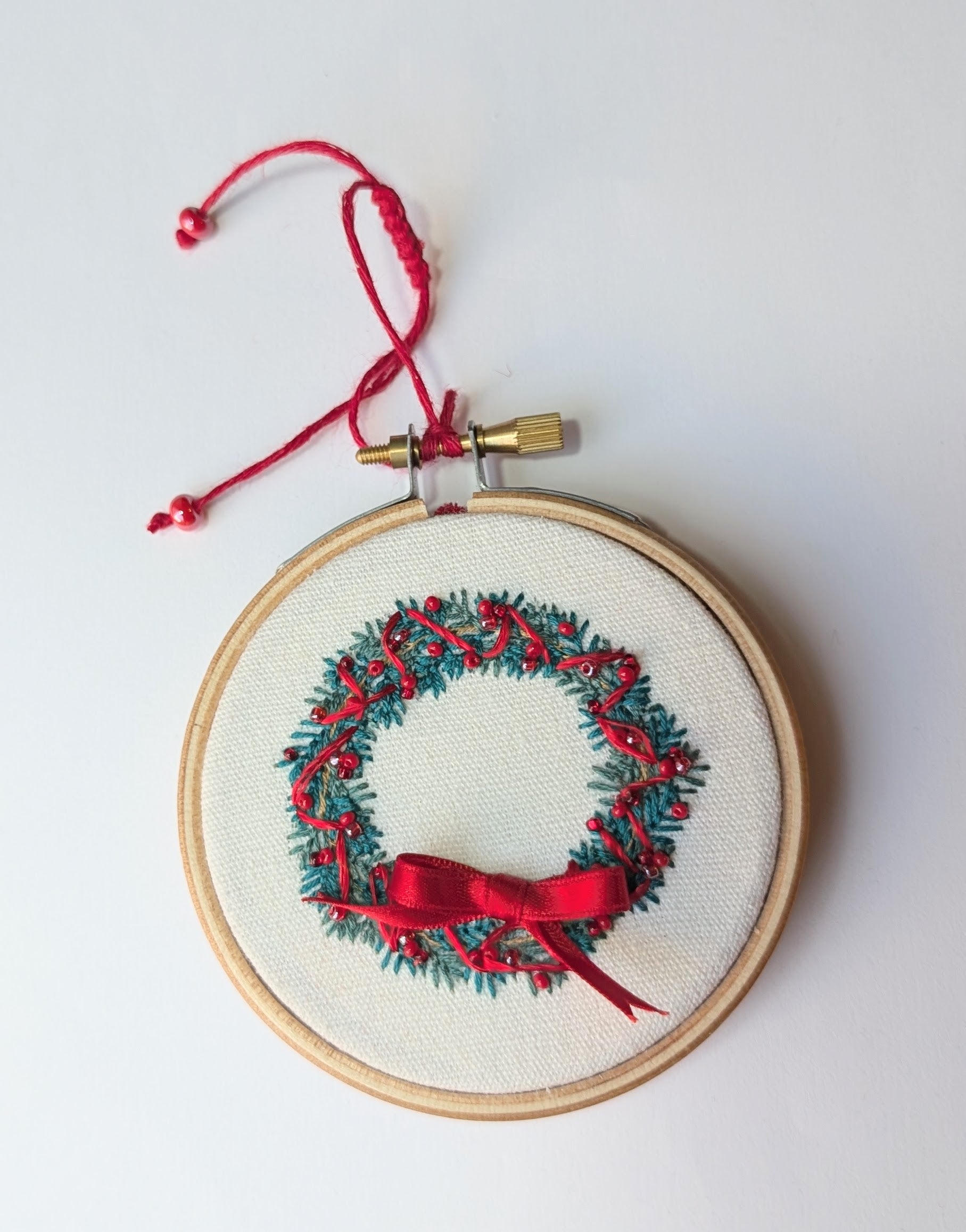 Cette couronne de sapin est brodée à la main, sertie de perles rouges et décorée d'une guirlande soyeuse et métallisée. Son nœud en ruban satinée rouge vif la complète avec grâce. Un ornement parfait pour un décor traditionnel et élégant.