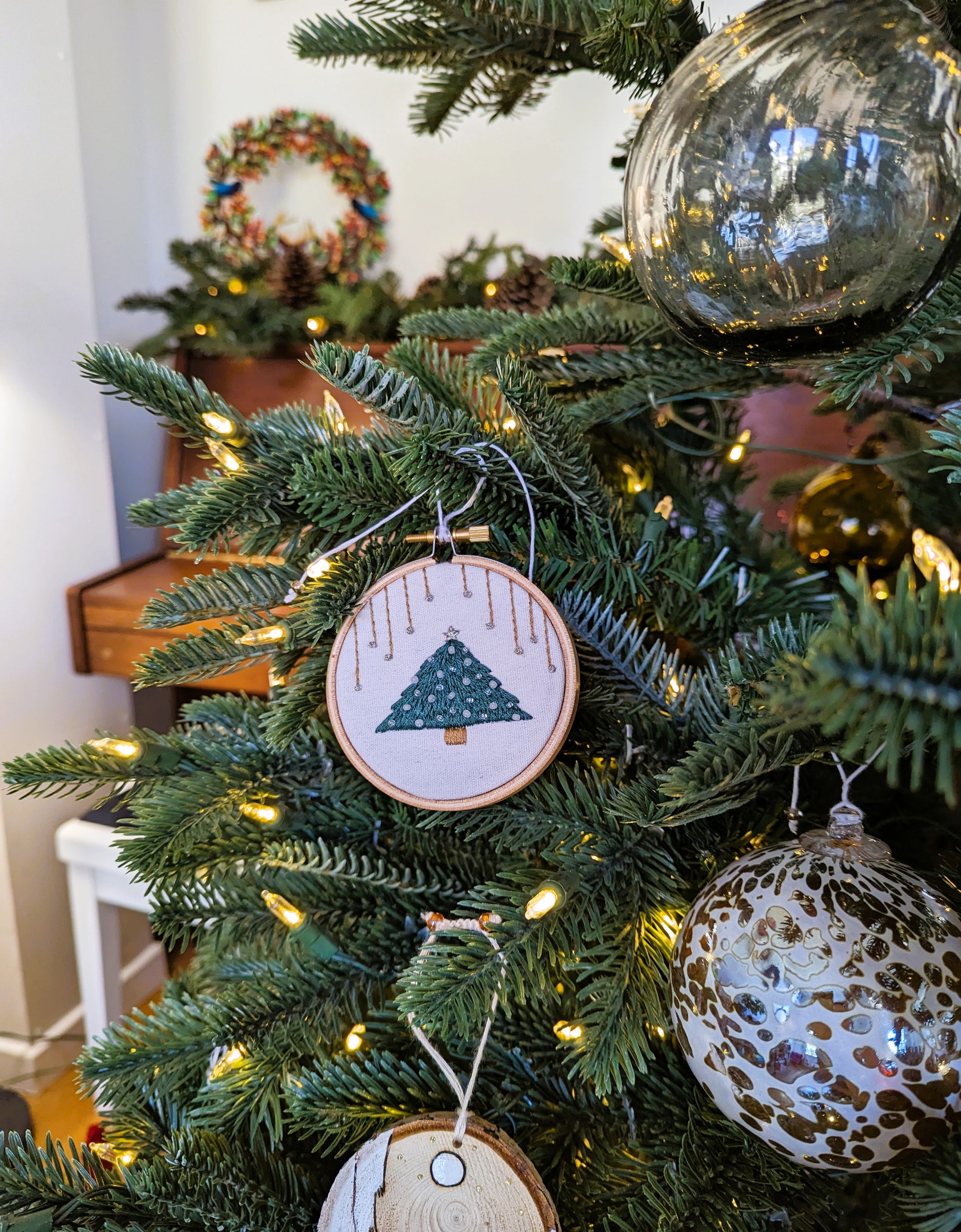 Un doux sapin brodé à la main, décoré de perles blanches et d'une étoile à sa cime. Un ornement qui sublime à merveille un décor de fête de blancheur hivernale.