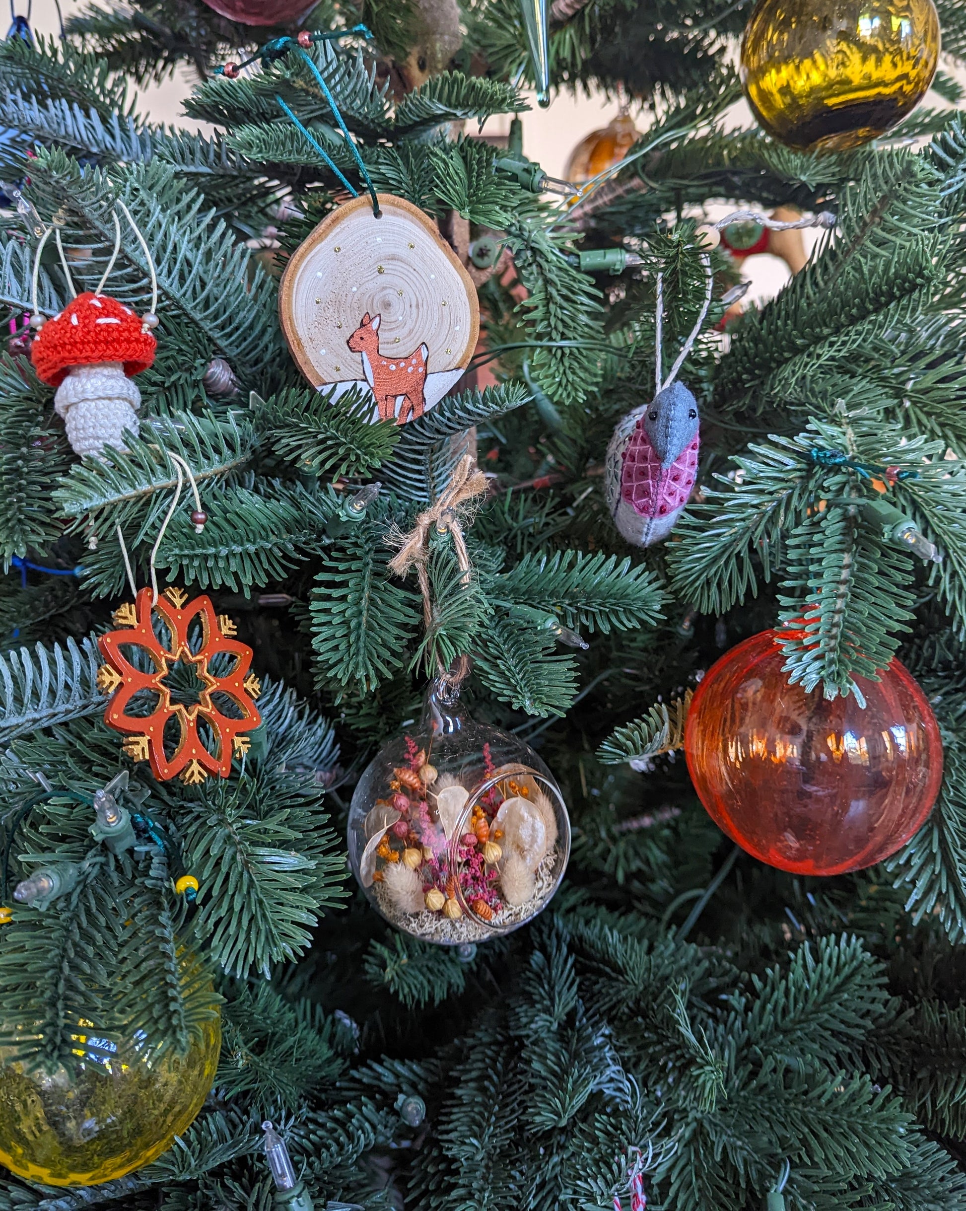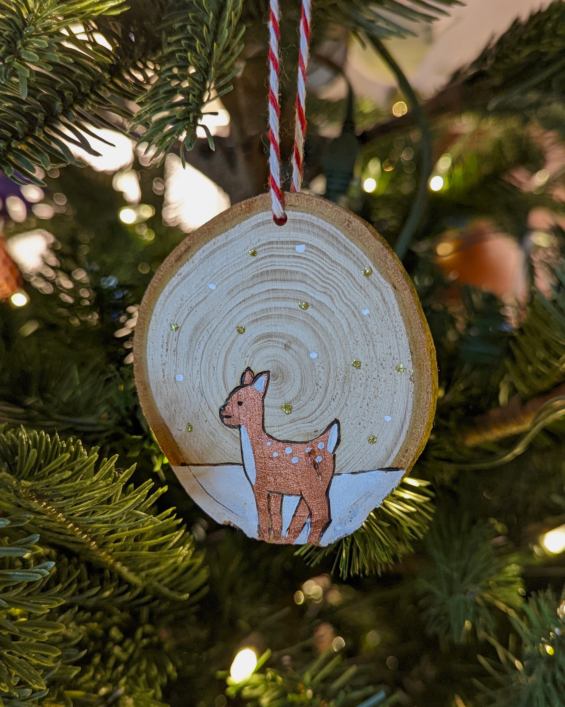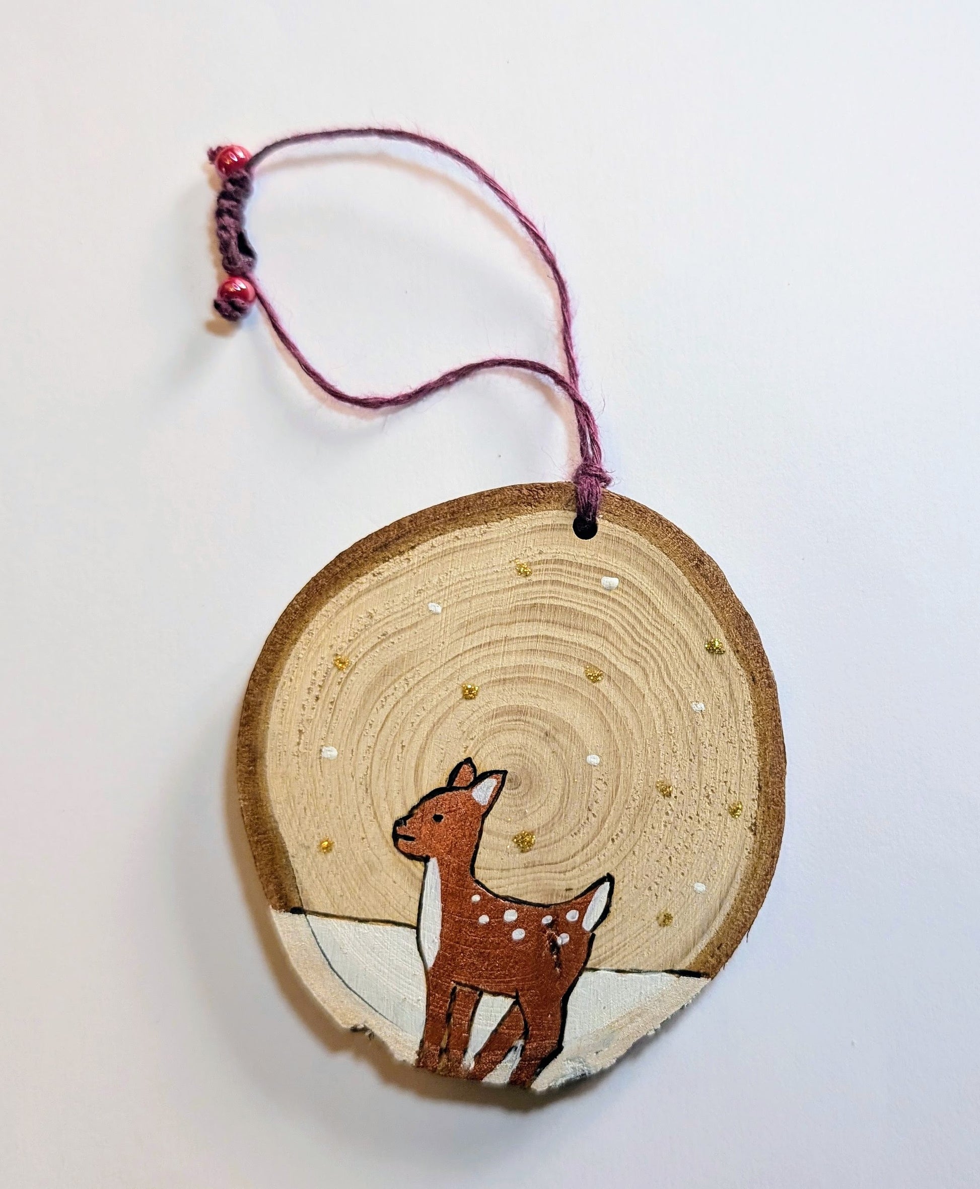 Aimant particulièrement les décorations de Noël naturelles aux couleurs traditionnelles, Sophie a imaginé des ornements en rondelles de bois en s'inspirant de la nature. Ses dessins, d'une belle tendresse, sont réalisés en pyrogravure puis peints et réhaussés deci delà d'une touche de paillettes.