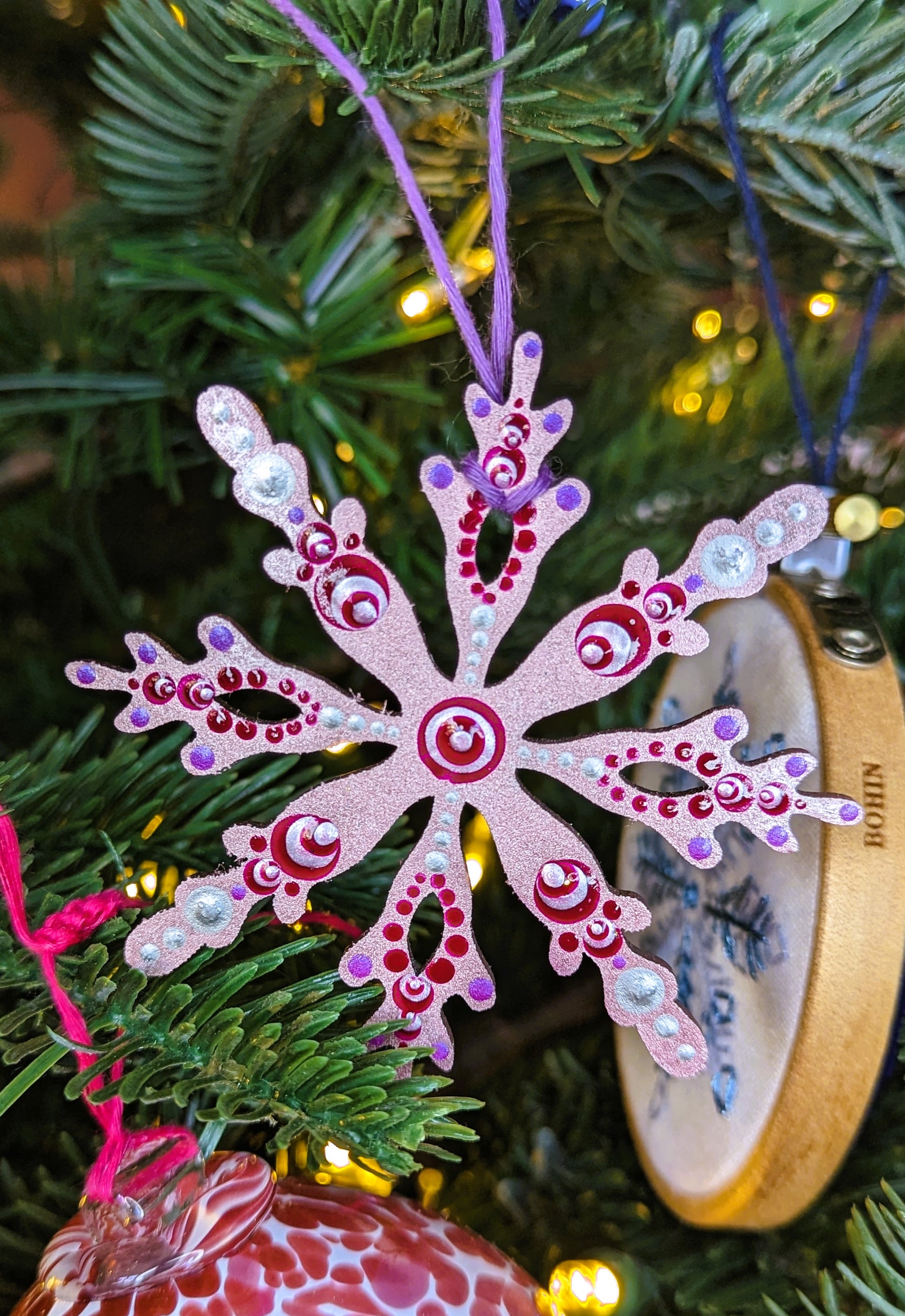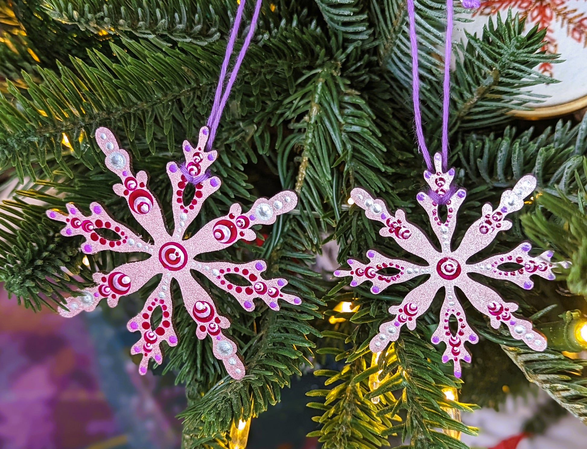 Le flocon Agathe, en bois de forêts françaises, est peint de rose et d'argenté à la main sur ses 2 faces pour décorer parfaitement votre sapin pop et coloré.
