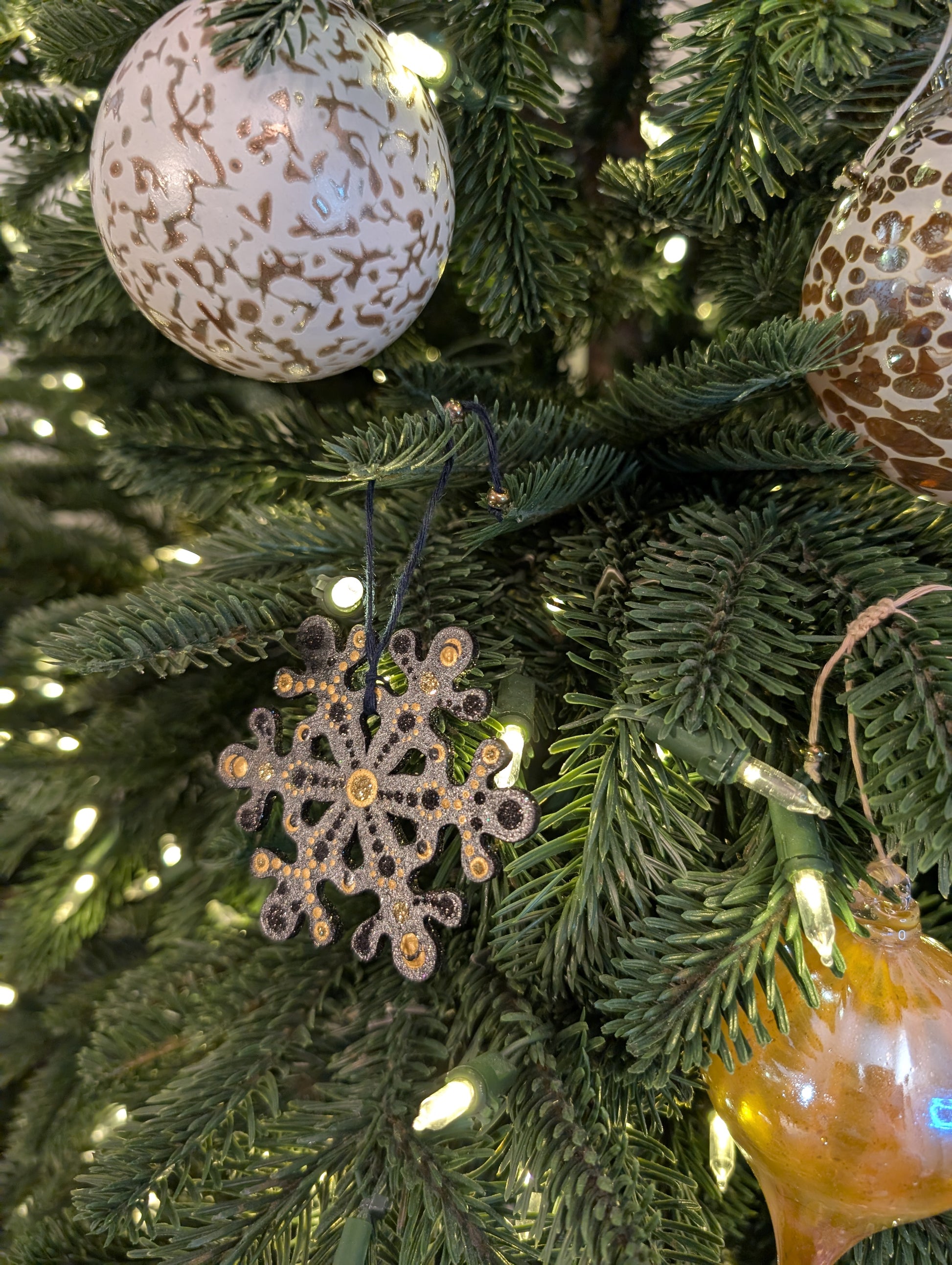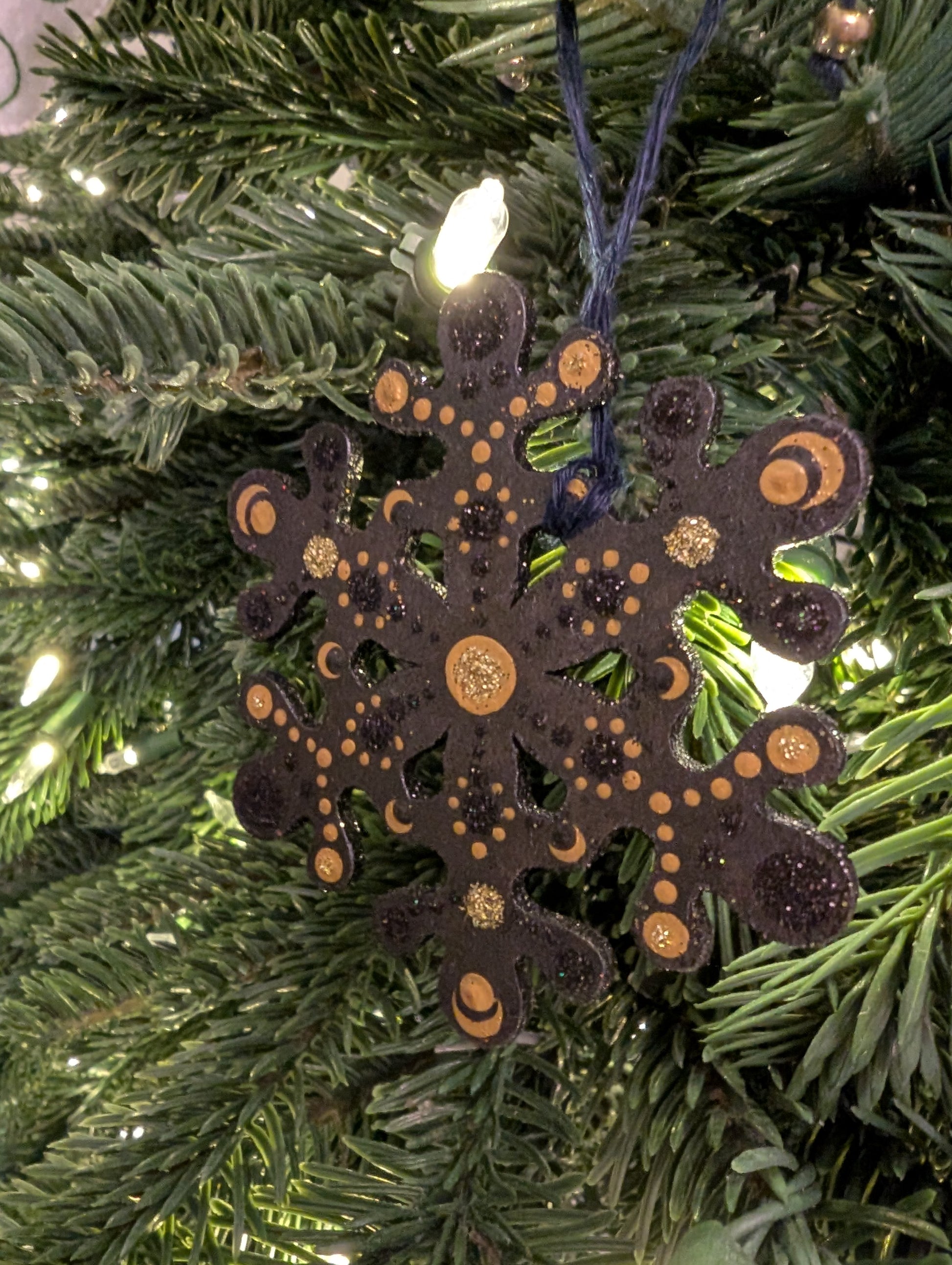 Le flocon Anne, en bois de forêts françaises, est peint de noir et doré à la main sur ses 2 faces pour sublimer parfaitement votre décor de fête original et élégant. Les paillettes sur son liseré accrochent la lumière et l'œil.