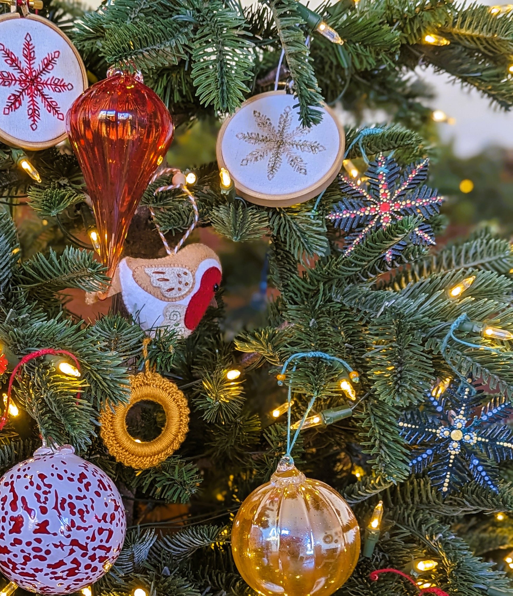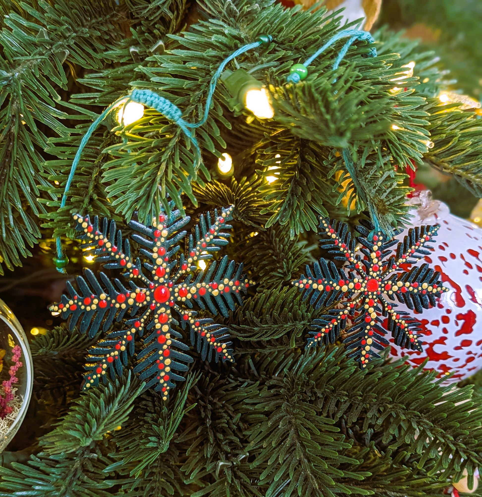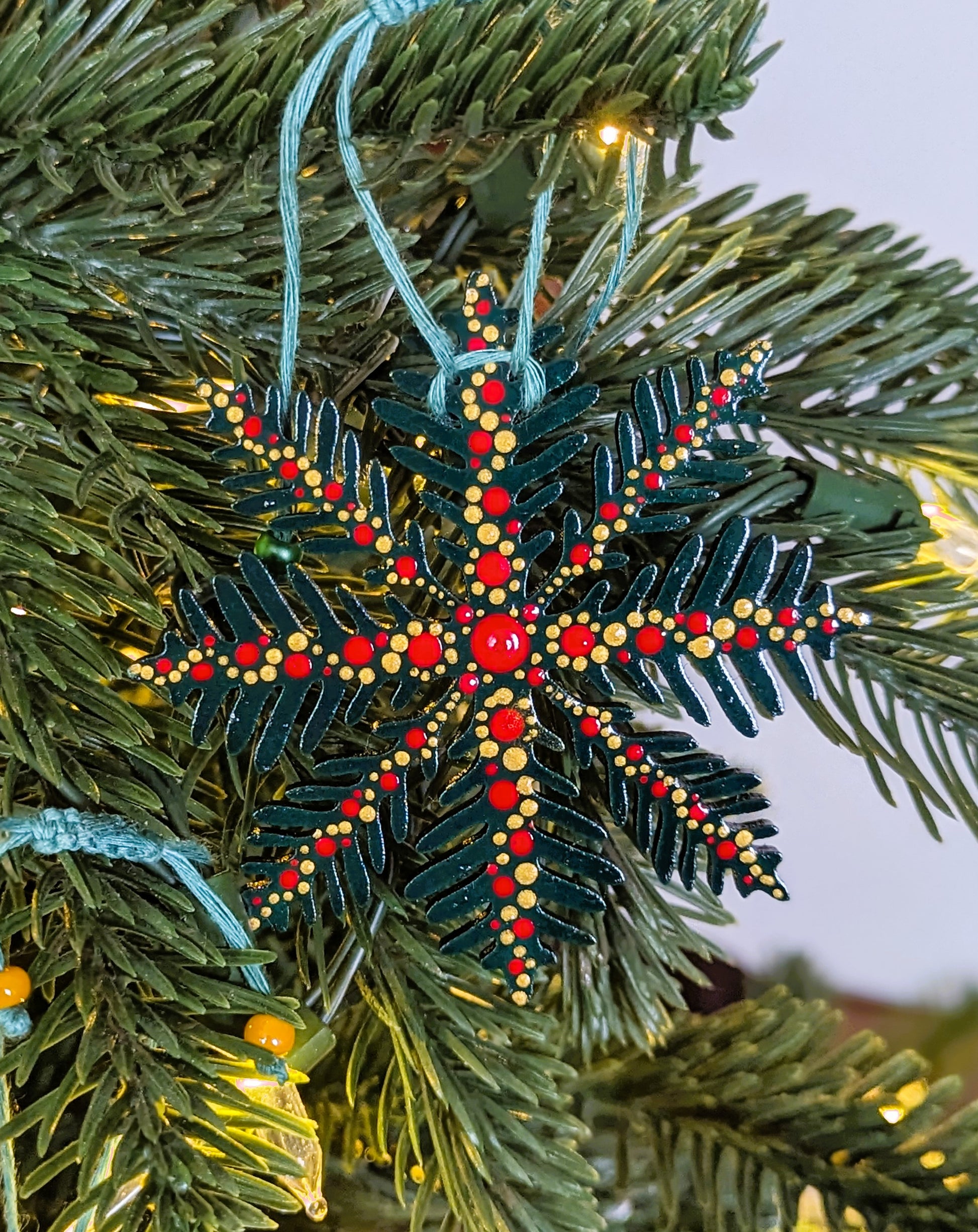 Le flocon Cassandre, en bois de forêts françaises, est peint à la main de vert et orné d'une guirlande de points rouges et dorés sur ses 2 faces pour sublimer parfaitement votre décor de fête traditionnel.