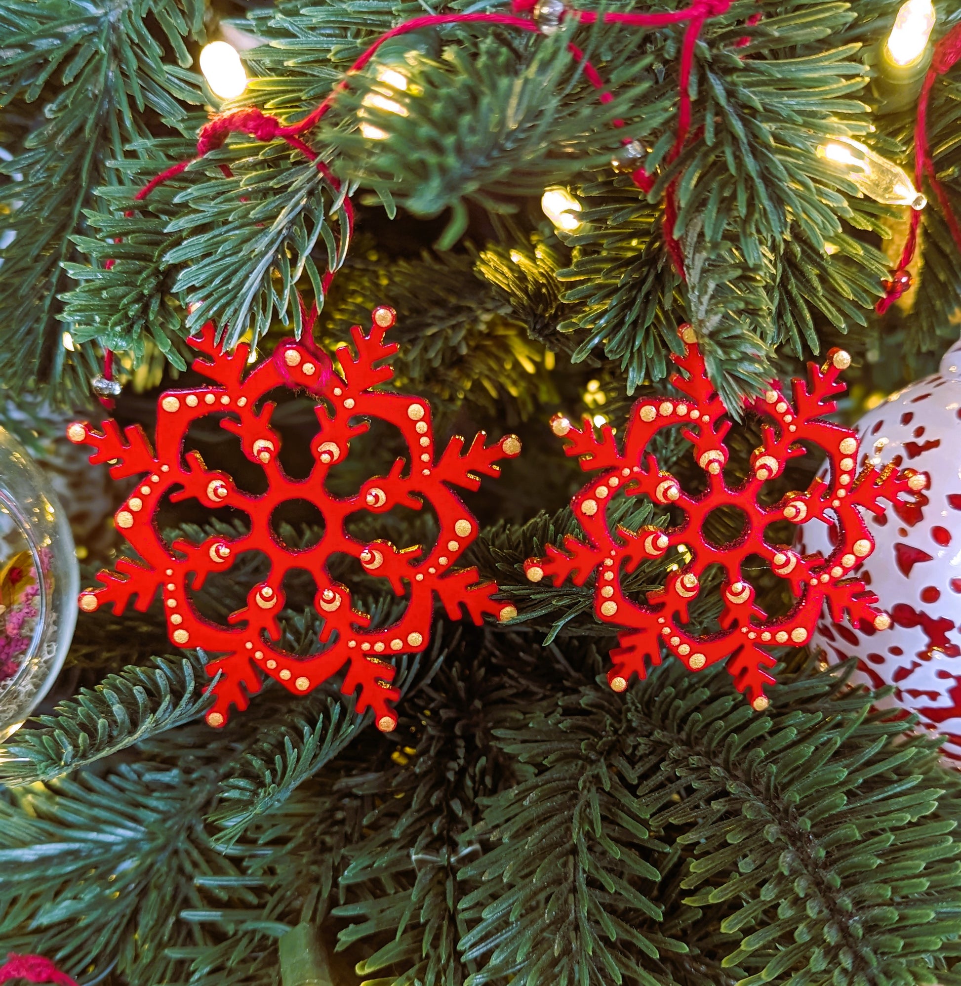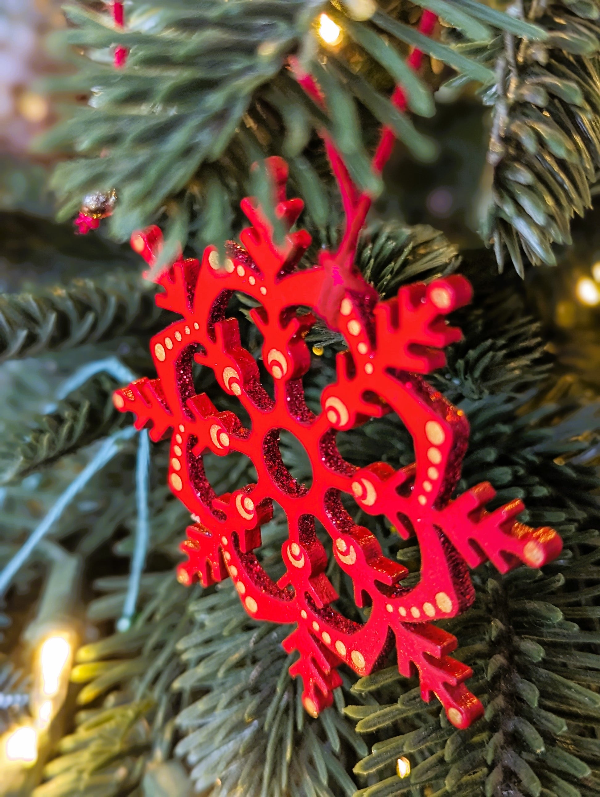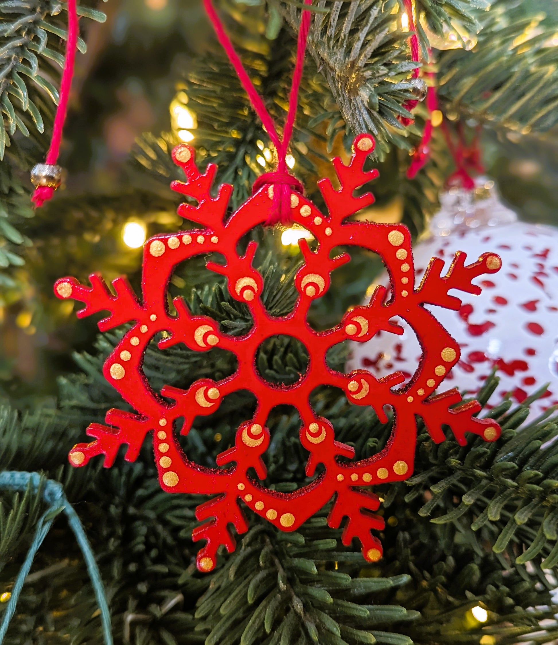 Le flocon Elisabeth, en bois de forêts françaises, est peint à la main de rouge et doré sur ses 2 faces pour sublimer parfaitement votre décor de fête traditionnel. Il est pailleté de rouge sur son liseré pour accrocher la lumière et l'œil.