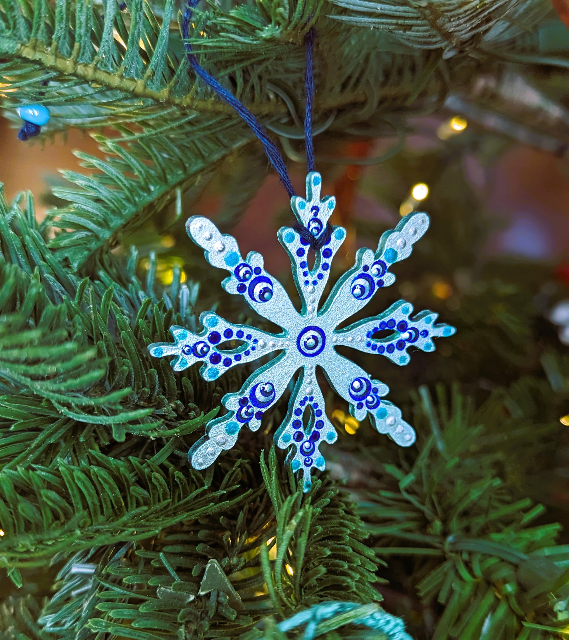 Le flocon Diane, en bois de forêts françaises, est peint de bleu et d'argenté à la main sur ses 2 faces pour décorer parfaitement votre sapin pop et coloré.