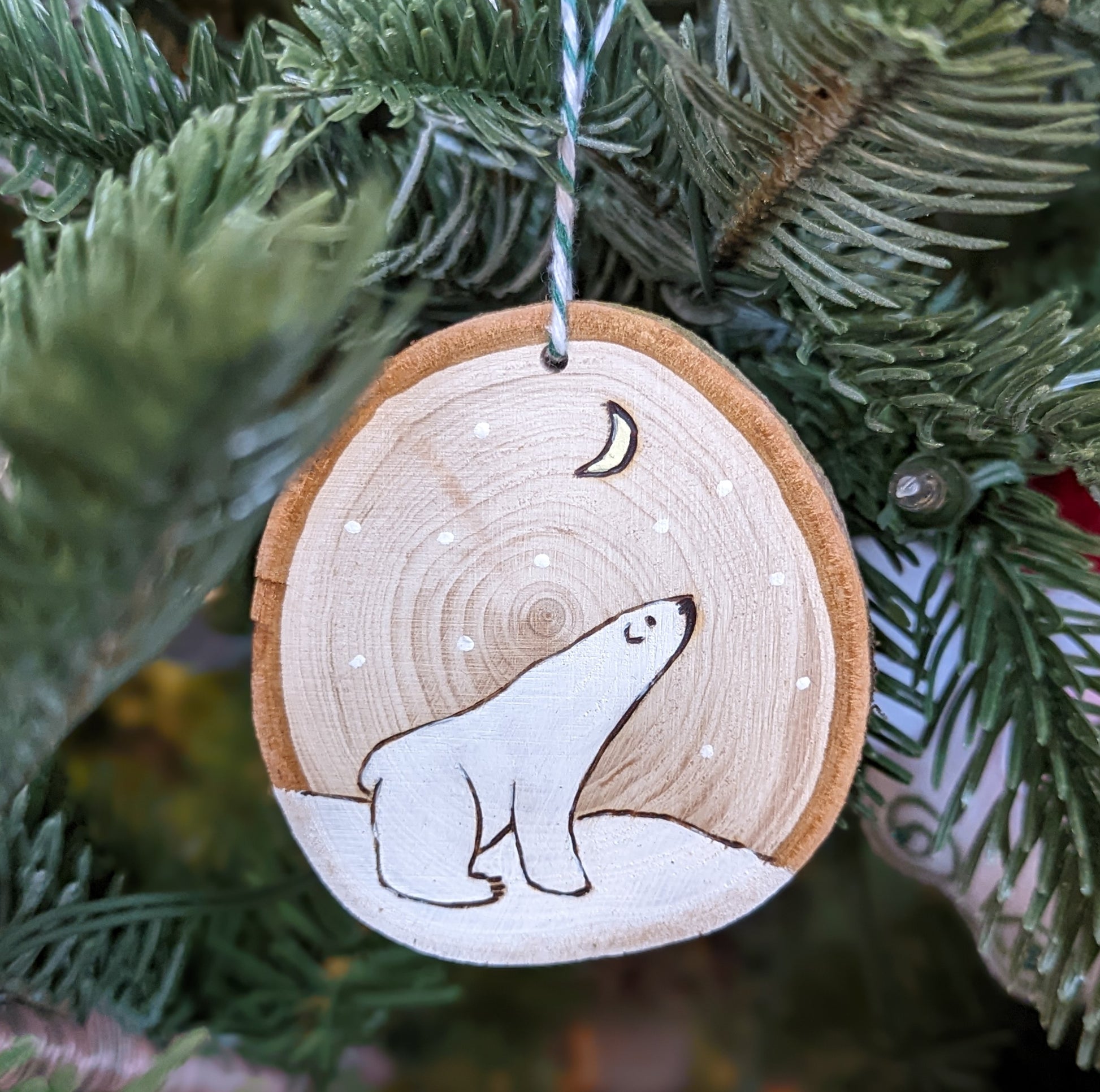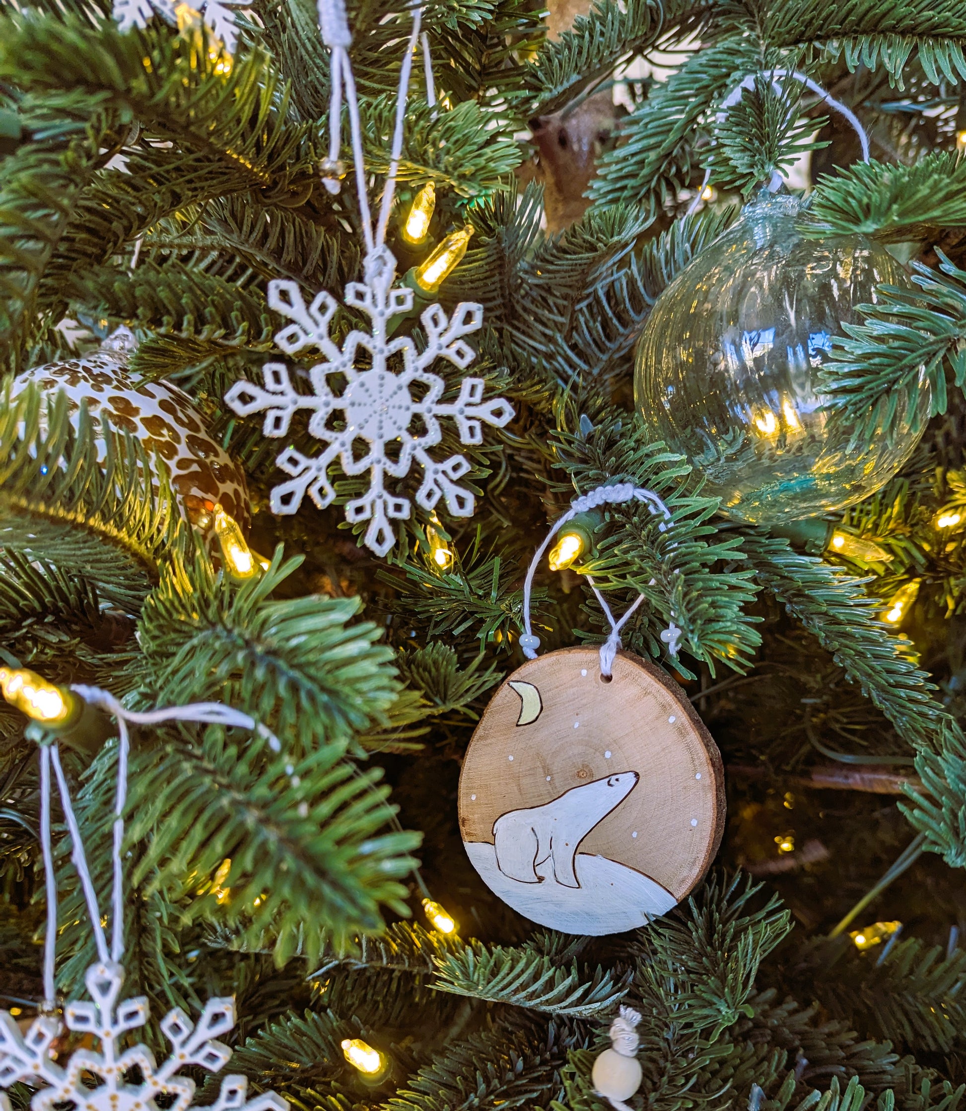 Aimant particulièrement les décorations de Noël naturelles aux couleurs traditionnelles, Sophie a imaginé des ornements en rondelles de bois en s'inspirant de la nature. Ses dessins, d'une belle tendresse, sont réalisés en pyrogravure puis peints et réhaussés deci delà d'une touche de paillettes.