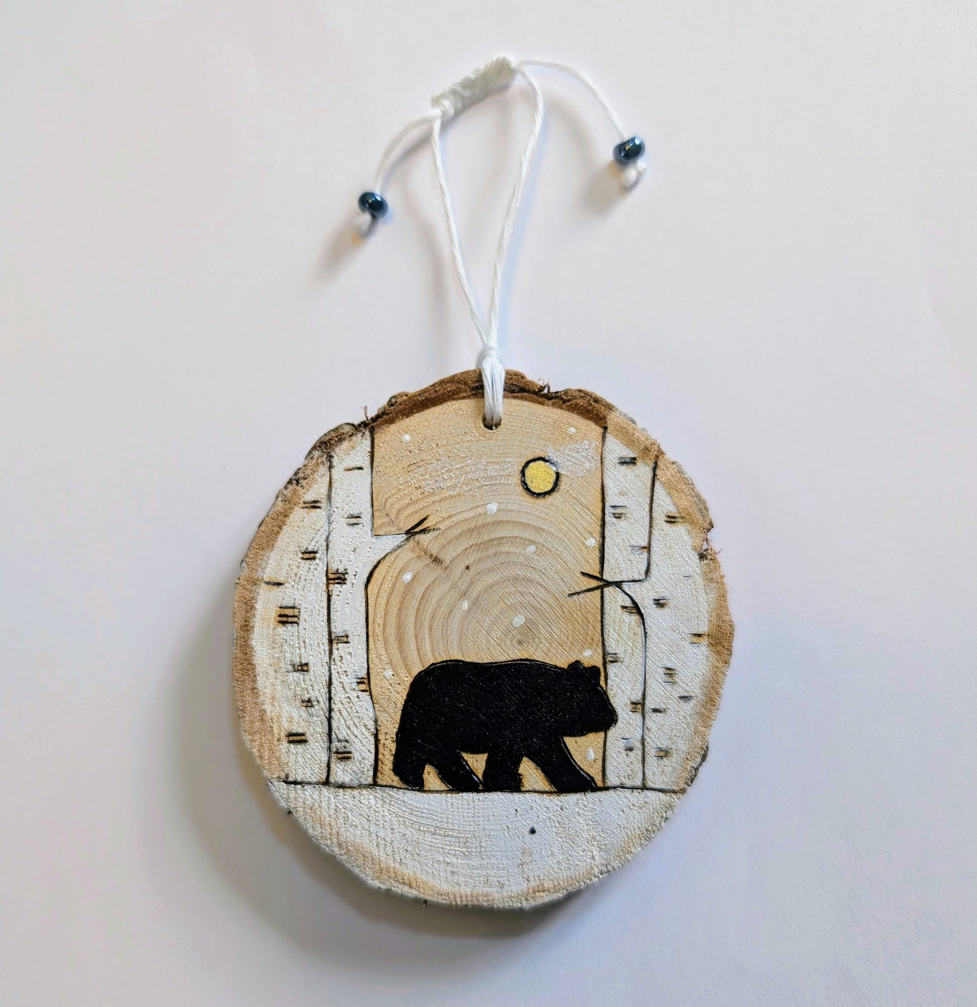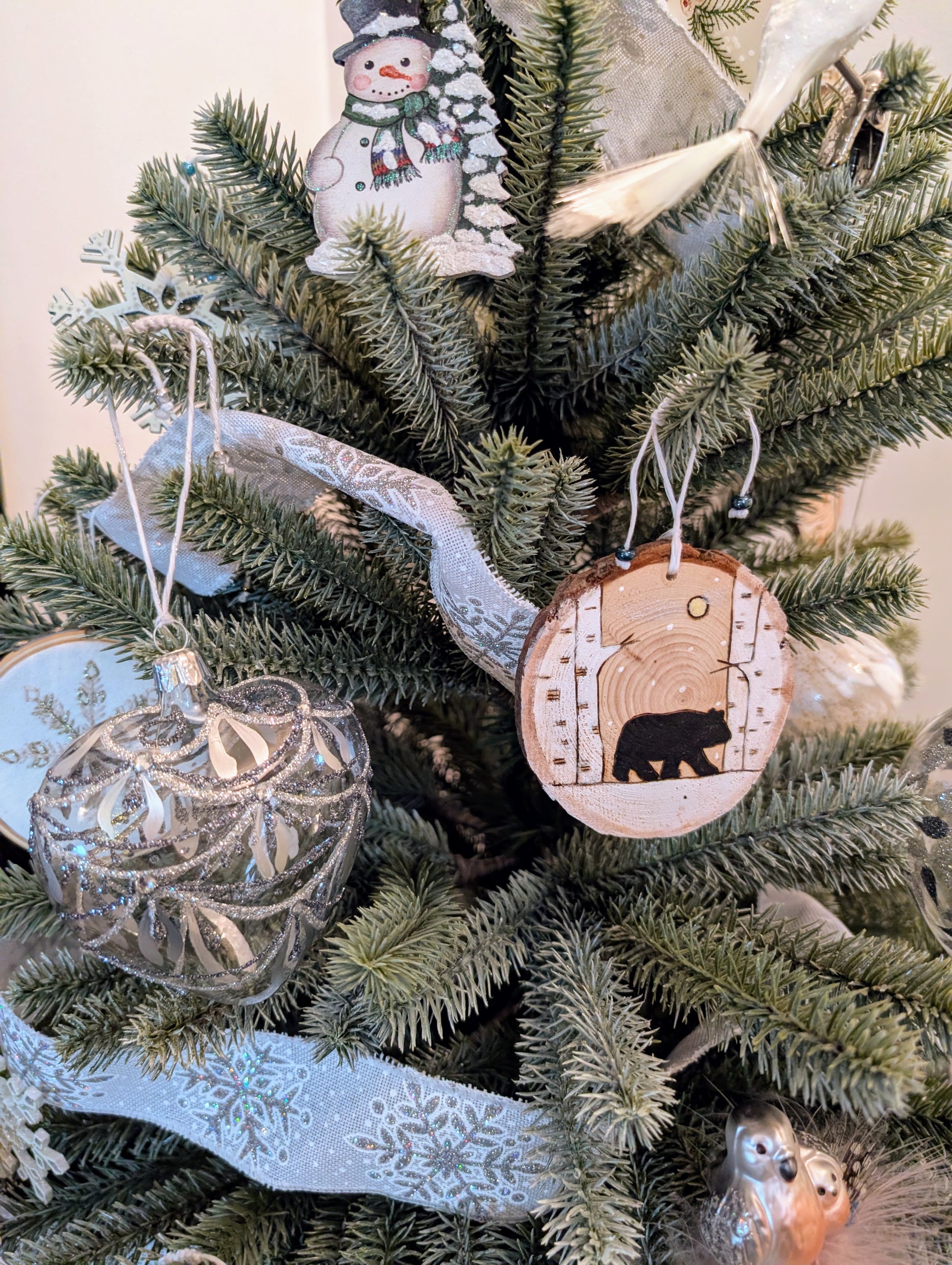 Aimant particulièrement les décorations de Noël naturelles aux couleurs traditionnelles, Sophie a imaginé des ornements en rondelles de bois en s'inspirant de la nature. Ses dessins, d'une belle tendresse, sont réalisés en pyrogravure puis peints et réhaussés deci delà d'une touche de paillettes.